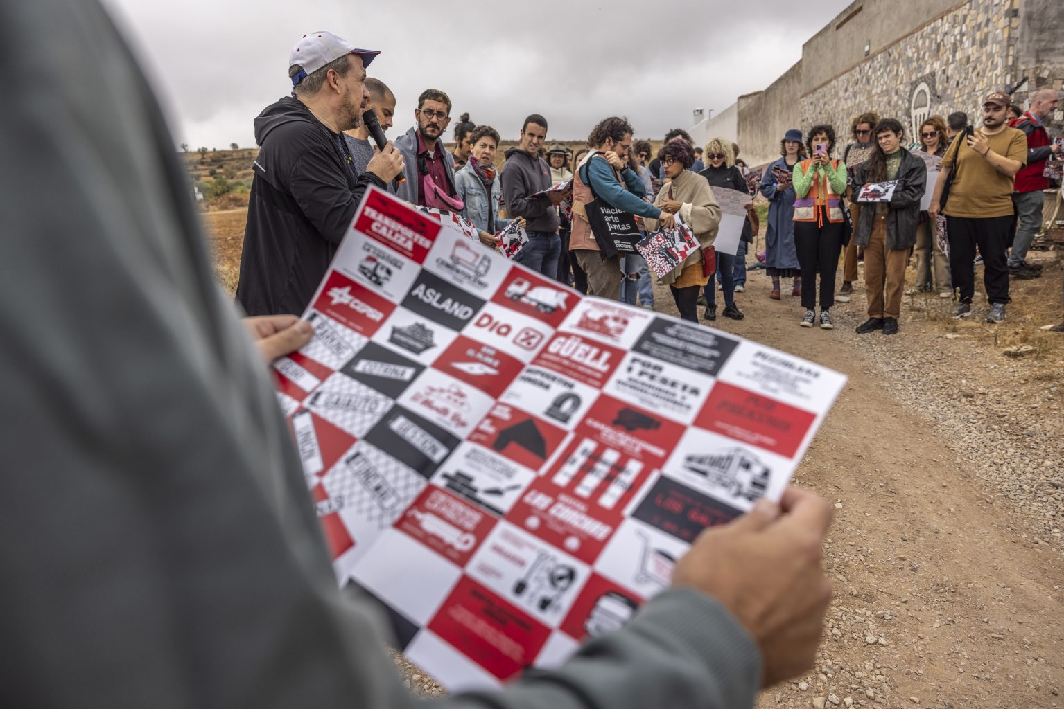 On the other hand, what a beautiful thing it is to never stop getting to know! At the beginning of the tour, we handed out a map in the form of a steering wheel (with which the public could “drive” while reading the information), which offered the names and descriptions of the interventions, some of which we decided not to visit that day. It gave the names and descriptions of the interventions, some of which we decided not to visit that day. What will be there? How do you imagine Bar Pepa de Brovales? What is the UHT place like? And what exactly is Aslandia? To paraphrase Luis Camitzer: community and participatory art practice should be a school, the artist learns to listen to the territory, the participants learn to inhabit uncertainty through imagination.