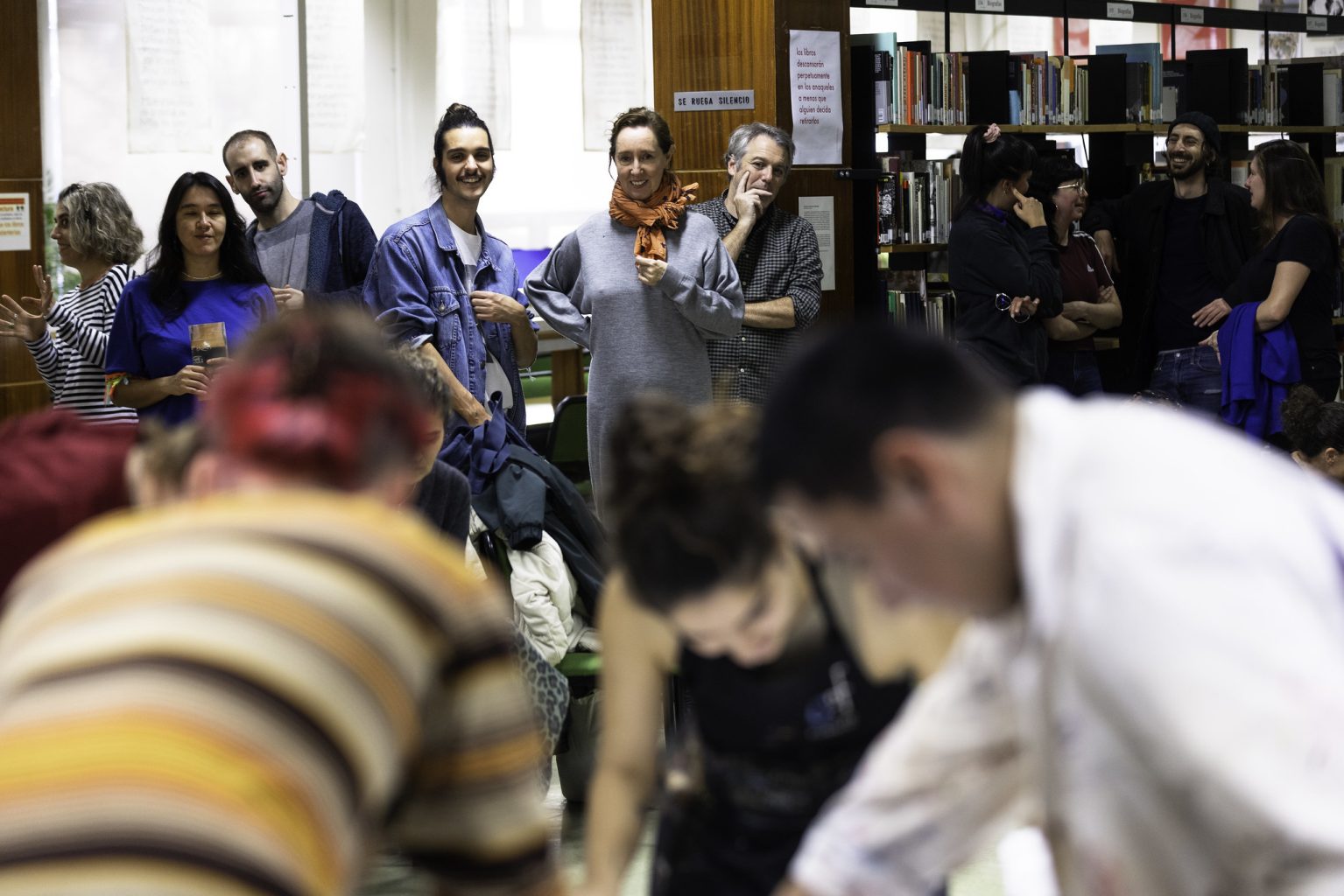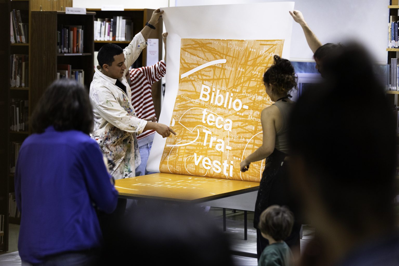 Así, la instalación mesas piel, mesas tatuaje, mesas secretos, mesas que hablan, preguntan, se buscan y se pierden, ideada por Iván Argote, busca dar cuenta de todas aquellas relaciones que se hacen y deshacen continuamente en este lugar, de los múltiples encuentros que las bibliotecas propician. Las mesas de madera, pertenecientes al mobiliario existente, fueron intervenidas por el artista con frases recopiladas a través de una convocatoria abierta que, durante varias semanas de 2023, invitó a todxs lxs usuarixs, visitantes y admiradorxs de este espacio a responder a tres preguntas: ¿Qué frases, versos, o citas evocan para ti la biblioteca? ¿Qué dirían las mesas de esta biblioteca si las dejamos hablar? ¿Qué palabras te gustaría que te acompañarán a ti y a otrxs por venir ahora y en cien años más?