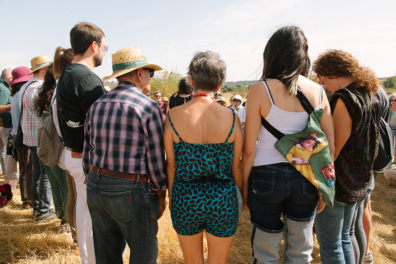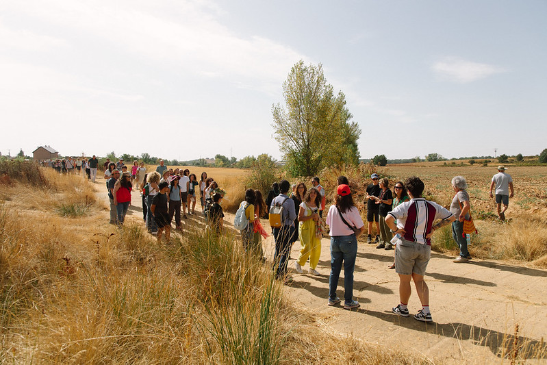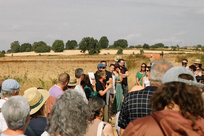 El segundo acto se refiere a los cuerpos. Poner los cuerpos en actos de resistencia tan sencillos como caminar por un camino rodeados de campos segados, amarillos por la gran sequía que ha asolado Castilla y León este pasado verano, huyendo de la inmediatez que nos exige el progreso para sentir cada pequeño sonido, olor o escalofrío de emoción. Este caminar que ha sido una de las metodologías de trabajo en las que hemos estado desde el inicio de la concomitancia, intentando senti-pensar con la diversidad de habitantes de La Sobarriba.