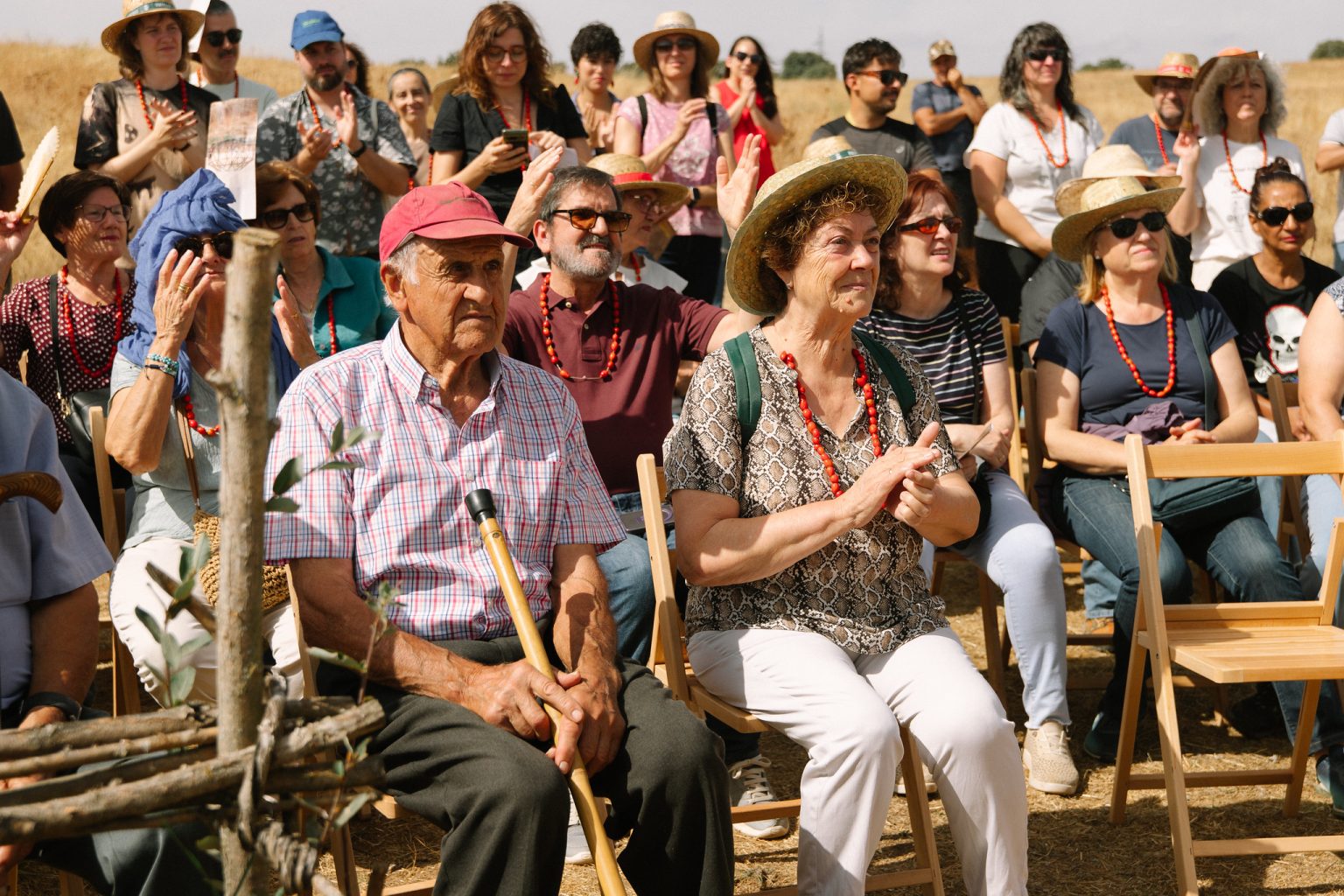El primero tiene que ver con un presente que se entregó a algunas de las asistentes que habían colaborado de alguna manera en el proceso de construcción de la pieza. Este regalo que consistía en un collar de agavanzas o escaramujos (el fruto de la rosa silvestre) que fue creado por vecinas de la comarca, cosiéndolos en las tardes del incipiente otoño. Escoger este fruto y ofrecerlo de esta manera nos habla de una comunidad de lo pequeño, de lo alejado de los grandes centros de poder, una comunidad que mira con los ojos llenos de amor hacia cada habitante humano y más que humano, una comunidad que como la rosa silvestre crece en el territorio a pesar de las dificultades.